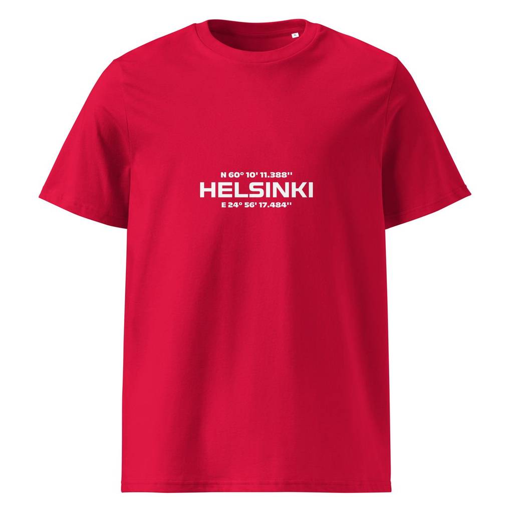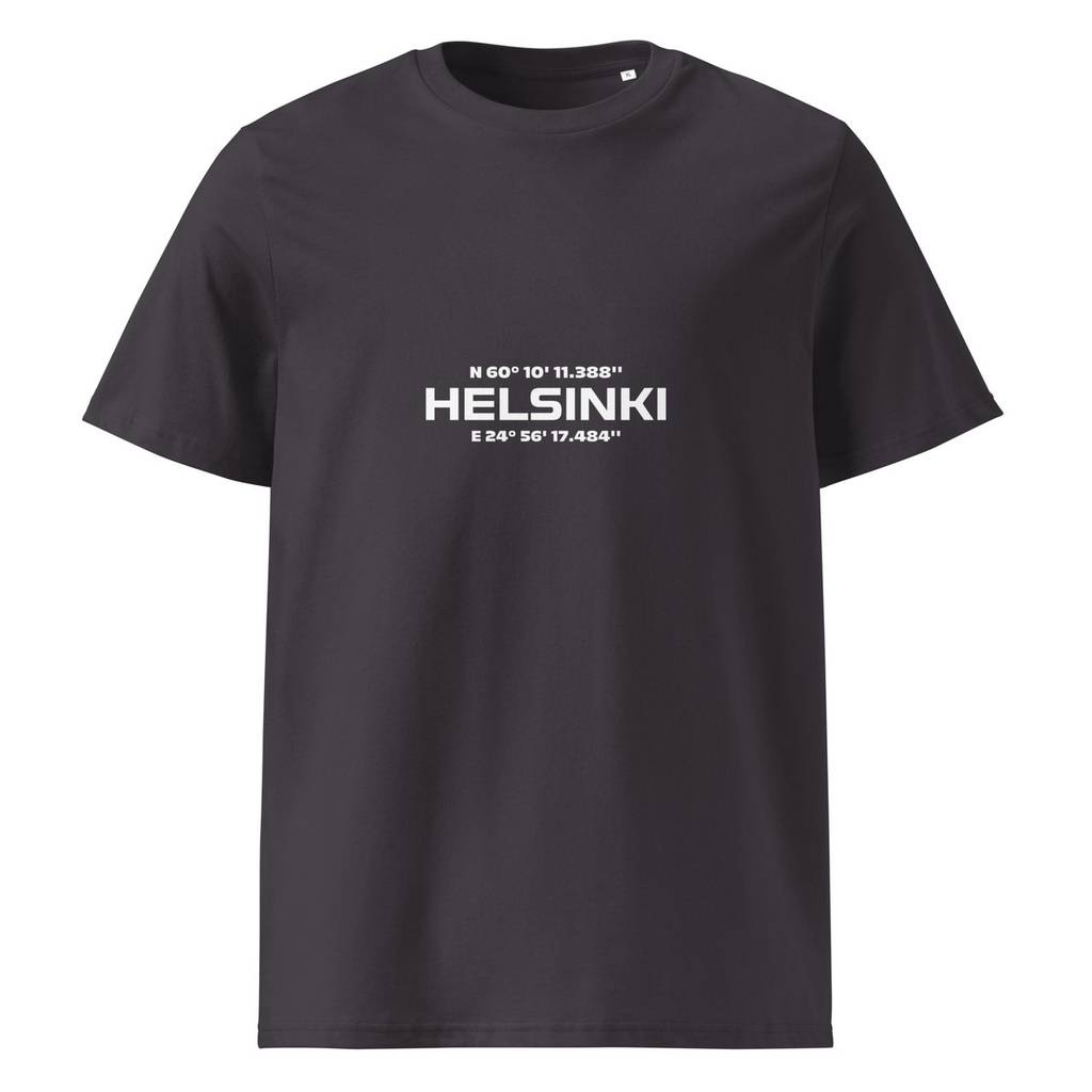 Helsinki-aiheinen unisex-mallin t-paita, joka sopii naisille ja miehille. T-paidassa printtaus, jossa Helsinki-teksti sekä GPS-koordinaatit. Tämä paita on ekologinen valinta, koska kangas on luomupuuvillasta valmistettu, sekä vahvan rakenteen ja laadukkaiden materiaalien vuoksi t-paita on kestävä ja pitkäikäinen. Lisäksi tämä tuote printataan tilausten mukaan, jolloin vältetään ylituotantoa ja turhaa varastointia.