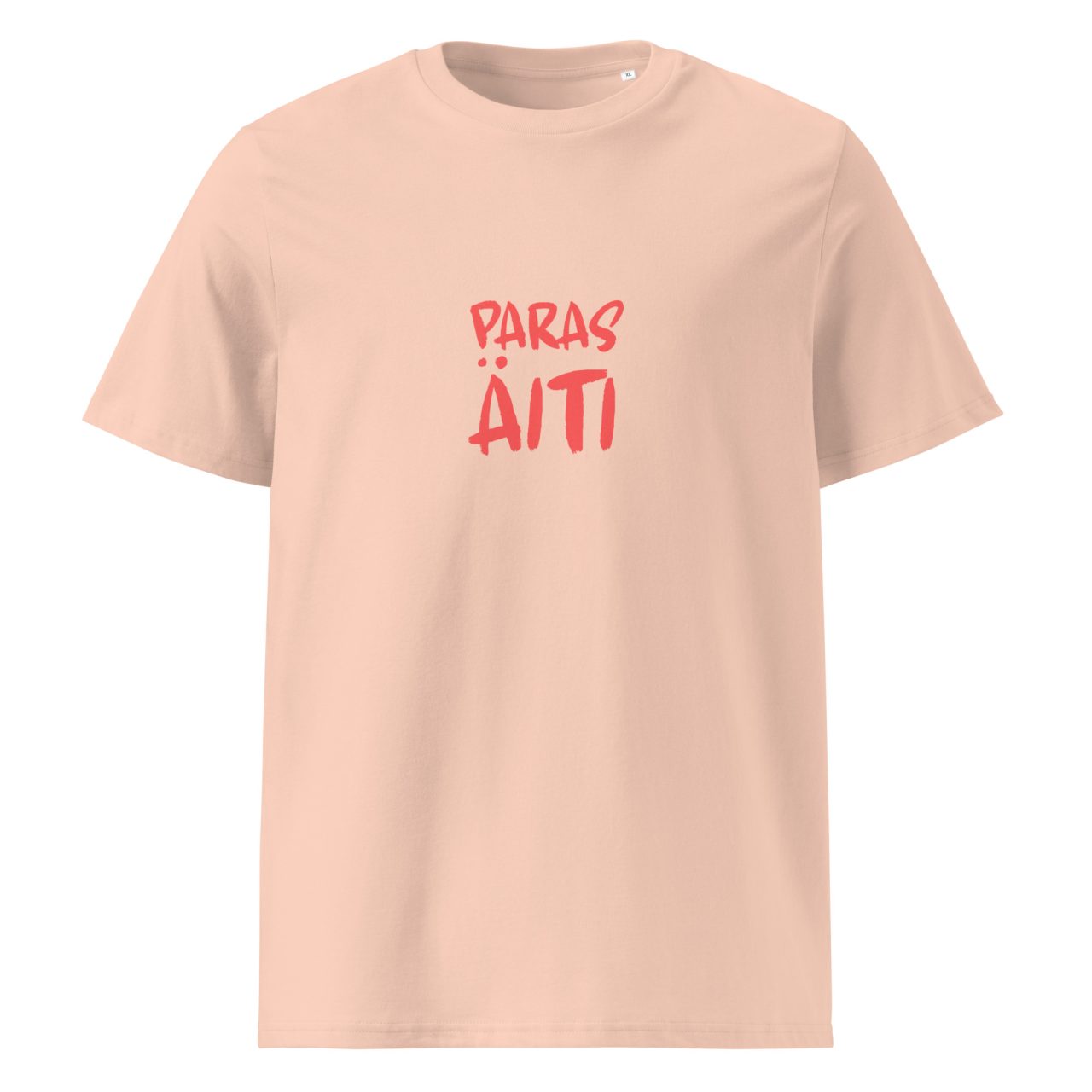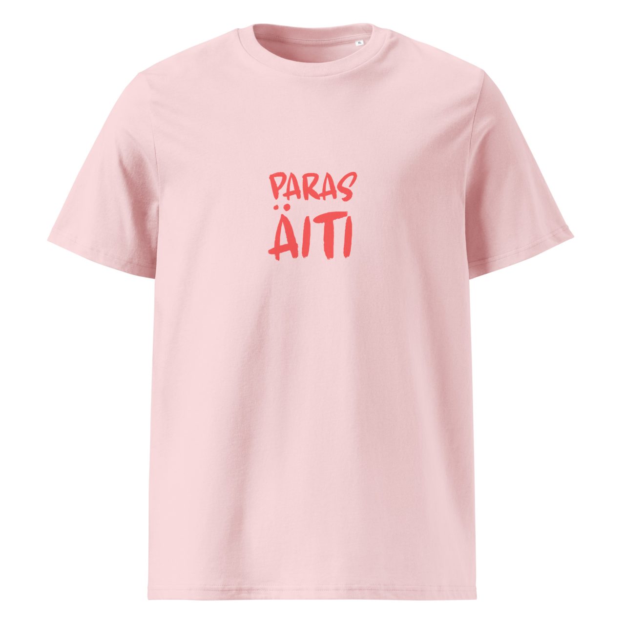 Paras äiti on unisex-mallin t-paita, joka on täyttä luomupuuvillaa. T-paidassa tyylikäs ”PARAS ÄITI” -teksti printattuna etupuolella. Paita on saatavilla useissa eri väreissä, valikoimissa koot S-2XL. Tekstiprinttauksen väri on kaikissa sama.